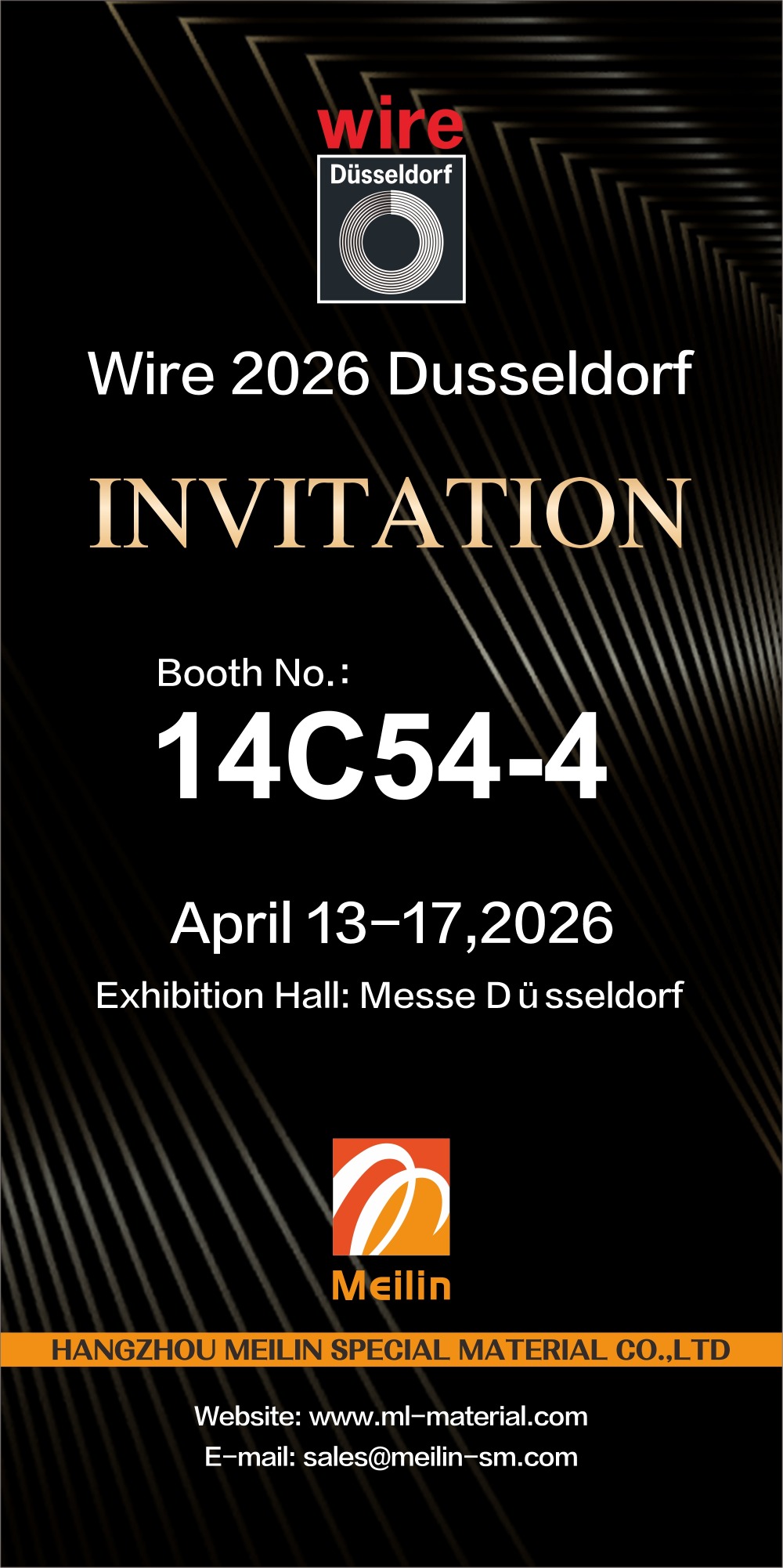 Wire 2026 Düsseldorf, главное глобальное мероприятие проводной и кабельной промышленности, пройдет с 13 по 17 апреля 2026 года в Messe Düsseldorf в Германии. Компания Hangzhou Meilin New Material Technology Co., Ltd. представит полный ассортимент продукции из кабельных материалов на выставке, расположенной по адресу: Стенд № 14C54-4 .