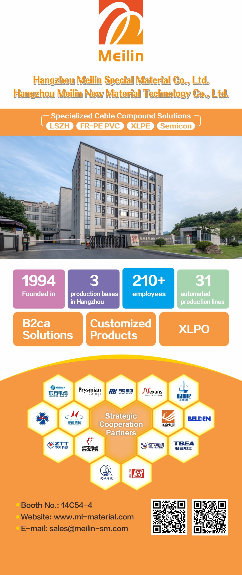 Основанная в 1994 году, компания имеет более чем 30-летний опыт работы в секторе кабельных материалов. В 2024 году в рамках стратегического расширения компании была создана компания Hangzhou Meilin Special Material Co., Ltd. Сегодня компания управляет тремя производственными базами, оснащенными 31 современной автоматизированной производственной линией, общая площадь застройки превышает 45 000 квадратных метров. В ее портфолио продукции входят LSZH, PVC, XLPE, SEMICON, SOLAR CABLE и другие серии, которые широко используются в энергетике, телекоммуникациях, новой энергетике и других областях. Благодаря мощным производственным возможностям и стабильному качеству продукции в 2024 году компания достигла годового объема производства более 700 миллионов юаней, обслуживая клиентов как внутри страны, так и за рубежом.